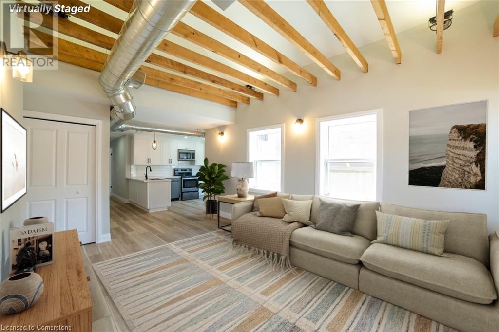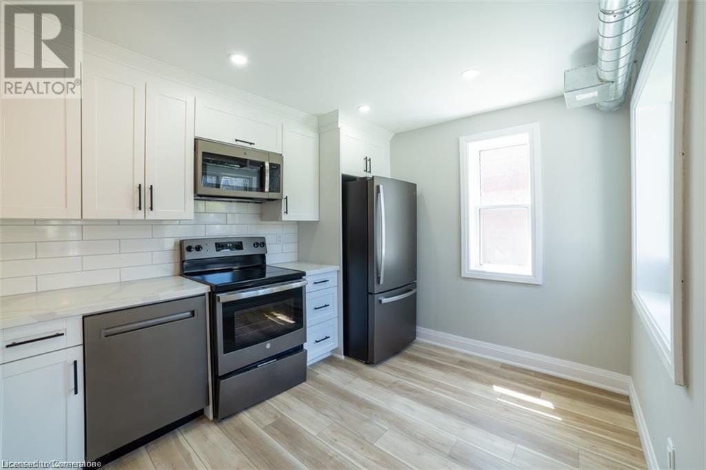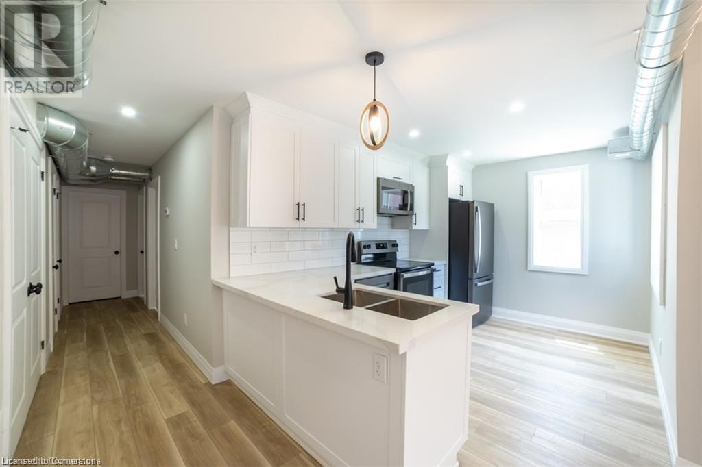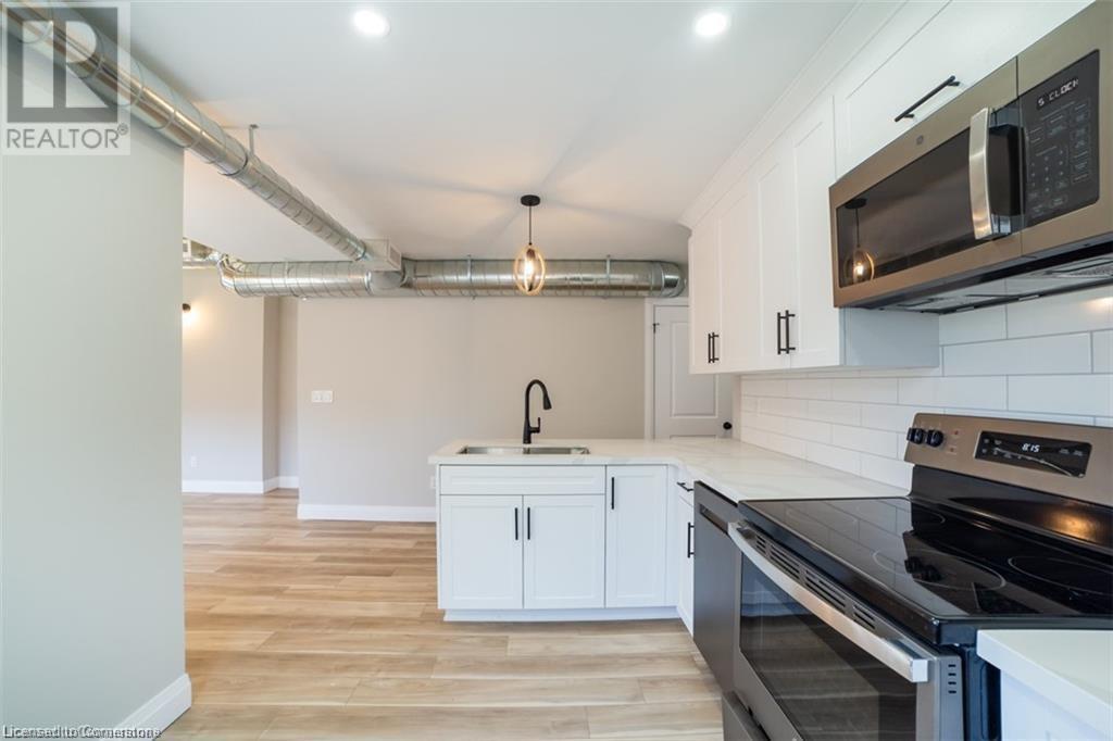 The location here can’t be beat in the hip and trendy Kirkendall neighbourhood. Welcome home to this fully renovated unit. Step inside and you’ll notice the bright, wide plank flooring that flows throughout. Look up and you’ll find beautiful exposed wooden beams, industrial light fixtures and exposed vents. The open-concept space is perfect for entertaining family and friends. In the kitchen, you’ll find white cabinets, quartz countertops, stainless steel appliances, black accents and subway tile backsplash. A kitchen that will make you want to cook up a great meal. The large, bright windows fill this unit with plenty of natural light. Good-sized bed rooms and a stunning bathroom offering an all-glass shower finishes off this unit. In-suite laundry, 1 parking spot and outdoor space make this the perfect home. Located in a prime area steps to Dundurn Castle, Locke Street shops and restaurants, easy public transportation access and close to McMaster University and highway access. (id:52163)